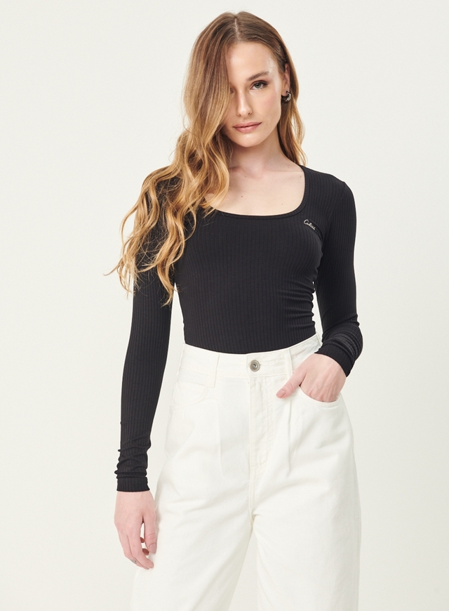 Blusa canelada apresenta shape slim em modelagem confortável. A peça possui gola arredondada, mangas curtas e logo da marca bordado na altura do busto.