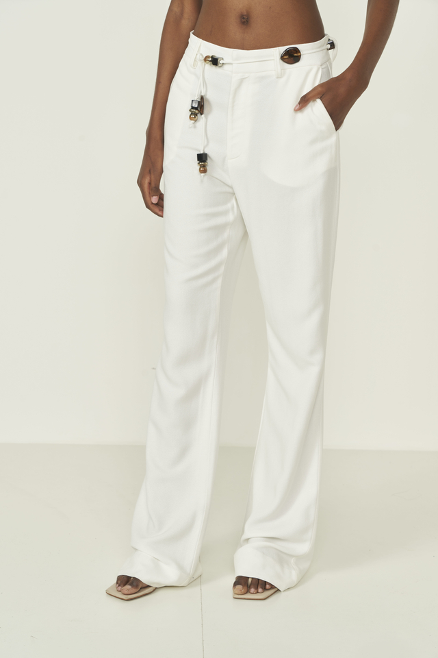 Peça: Calça Roby Com Cinto. Cor: Branco Puro (uma tonalidade clássica e essencial para o verão). Tecido: Confeccionada em 100% Viscose, proporcionando um caimento extremamente fluido, leve e confortável, ideal para as altas temperaturas. Design: Modelagem de cintura alta com pernas amplas (pantalona), que garante movimento e uma silhueta alongada. Possui cós com passantes e fechamento frontal em zíper e botão. Contém bolsos laterais funcionais e bolsos traseiros embutidos. Detalhes: Acompanha um cinto de corda removível, adornado com elementos de madeira e resina em tons terrosos, que adiciona um toque artesanal e sofisticado à peça. Funcionalidade: Respirável, leve e com caimento impecável, é perfeita para compor looks elegantes e confortáveis, adaptando-se a diversas ocasiões do verão.
