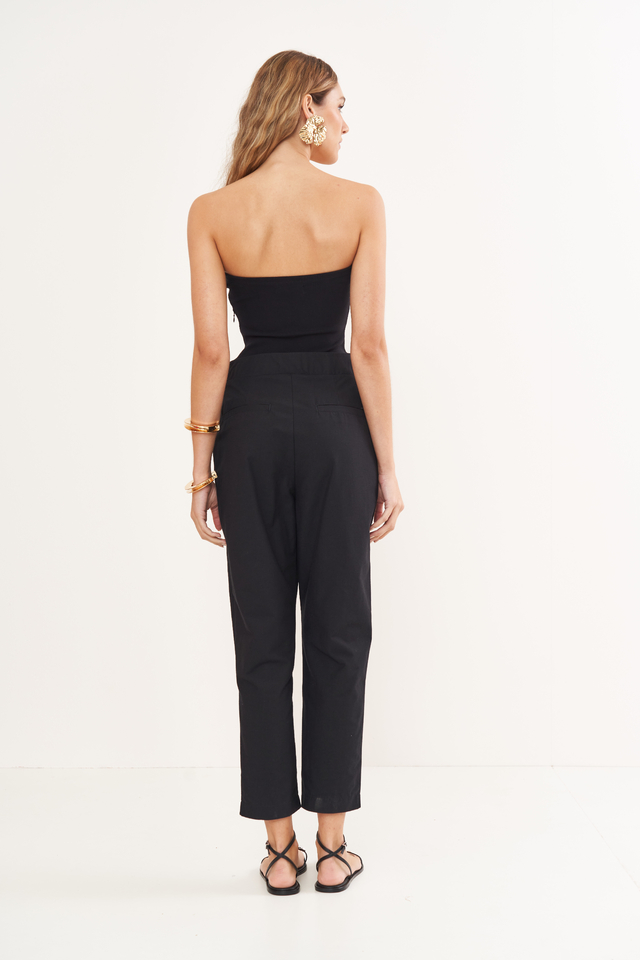 Design: Peça única com top tomara que caia (strapless) justo ao corpo e calça de alfaiataria com modelagem reta, cintura alta e comprimento cropped.